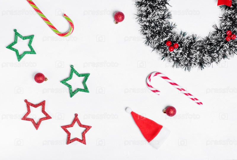 Новогодний фон на белом с разноцветными звездами, леденцами, венком, шляпой Санты и красными безделушками. Праздничная плоская планировка. Копировать пространство