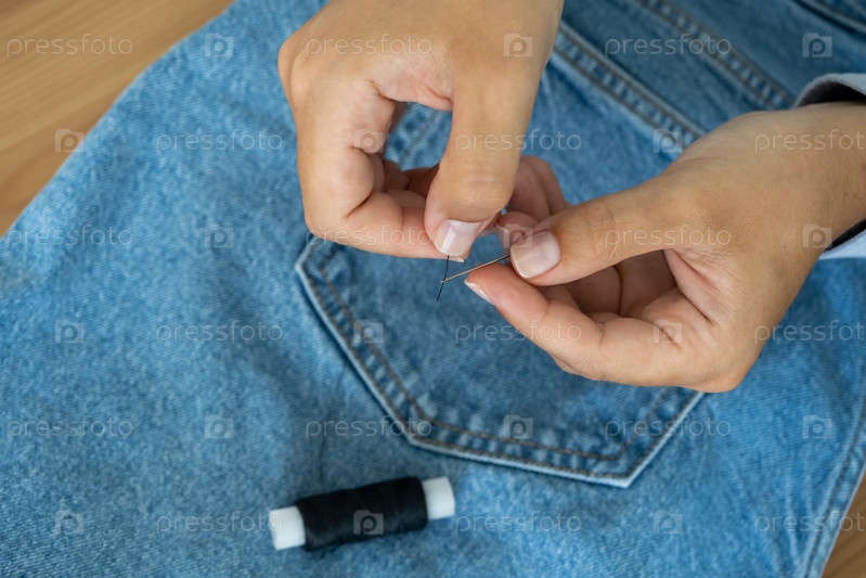 Руки швеи, продевающей иглу на фоне джинсов, концепция хобби