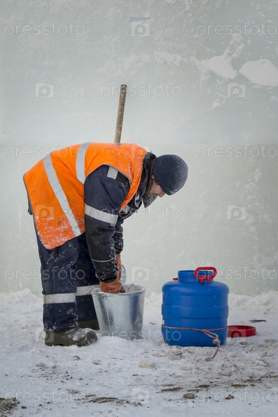 Сборщик в комбинезоне на территории ледового городка