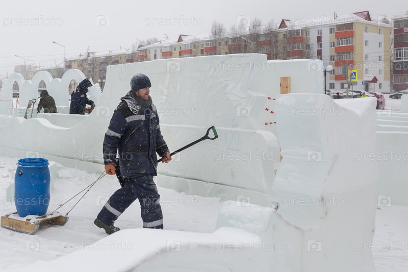 Сборщик в комбинезоне на территории ледового городка