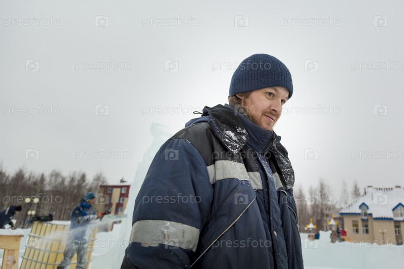 Сборщик в комбинезоне на территории ледового городка