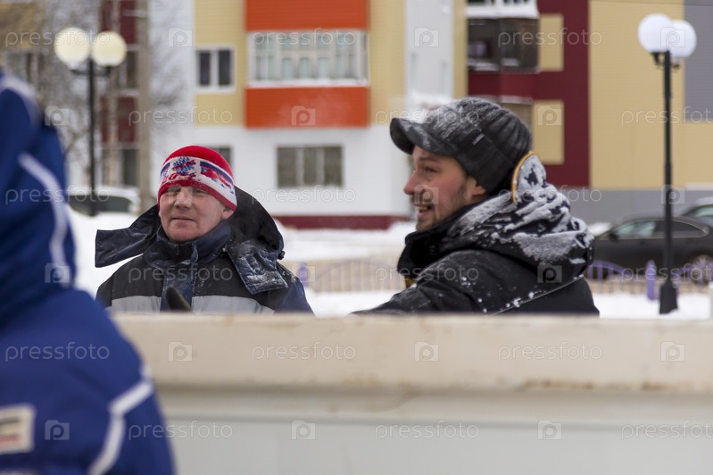 Двое рабочих разговаривают на сборочной площадке