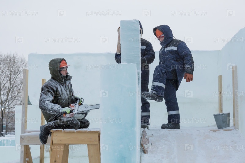 Рабочие на монтаже ледового городка