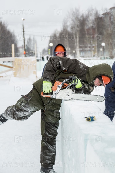 Рабочий режет кусок льда бензопилой
