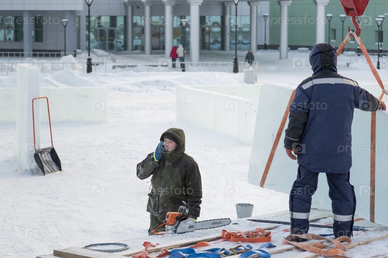 Рабочие выгружают ледяные глыбы из машины