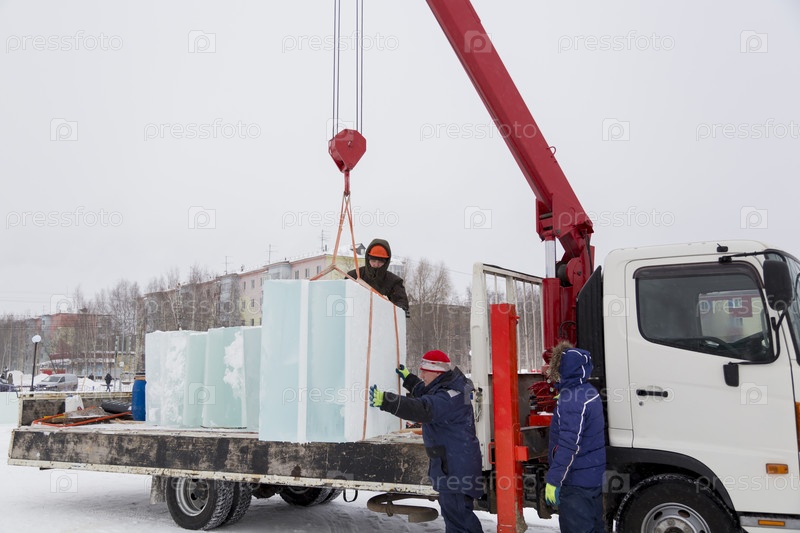 Рабочие выгружают ледяные глыбы из машины