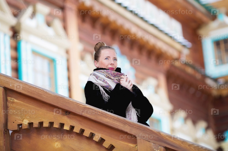 Русская блондинка в платке в морозный зимний день. Русские традиции и культура. Портрет красивой молодой женщины