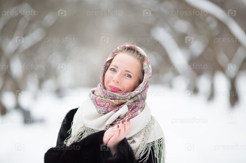 Русская блондинка в платке в морозный зимний день. Русские традиции и культура. Портрет красивой молодой женщины