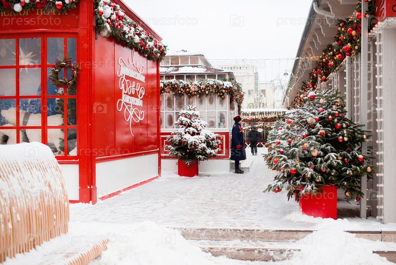 Новогоднее оформление Тверской улицы в классических красно-зеленых тонах. Красивые праздничные городские пейзажи Москвы. Украшенные елки и снег