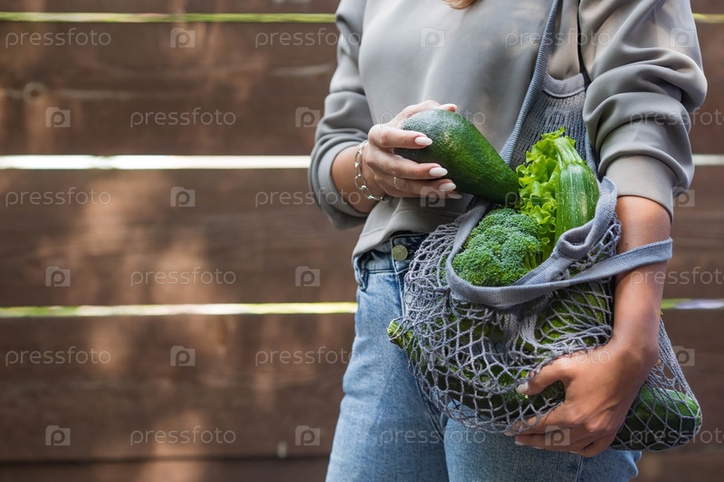 Женские руки с авоськой и зелеными овощами крупным планом. Девушка покупает еду. Концепция здорового питания, вегетарианства и экологии. Отказ от пластиковых пакетов