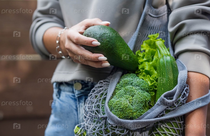 Женские руки с авоськой и зелеными овощами крупным планом. Девушка покупает еду. Концепция здорового питания, вегетарианства и экологии. Отказ от пластиковых пакетов
