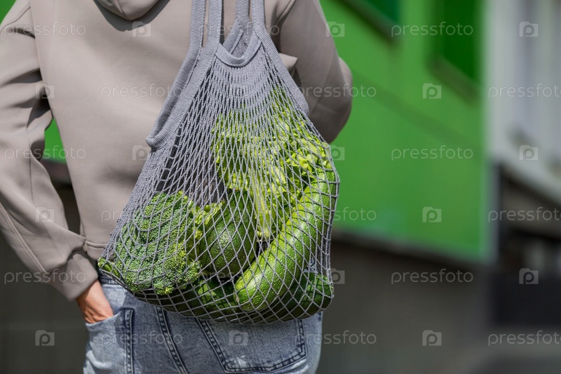 Женские руки с авоськой и зелеными овощами крупным планом. Девушка покупает еду. Концепция здорового питания, вегетарианства и экологии. Отказ от пластиковых пакетов