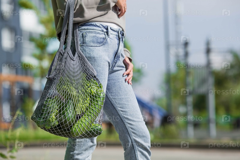 Женские руки с авоськой и зелеными овощами крупным планом. Девушка покупает еду. Концепция здорового питания, вегетарианства и экологии. Отказ от пластиковых пакетов