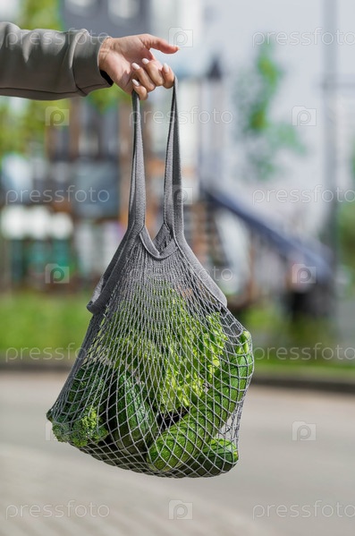 Женские руки с авоськой и зелеными овощами крупным планом. Девушка покупает еду. Концепция здорового питания, вегетарианства и экологии. Отказ от пластиковых пакетов