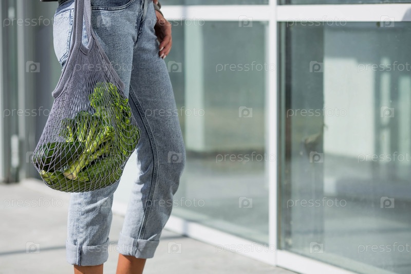 Женские руки с авоськой и зелеными овощами крупным планом. Девушка покупает еду. Концепция здорового питания, вегетарианства и экологии. Отказ от пластиковых пакетов