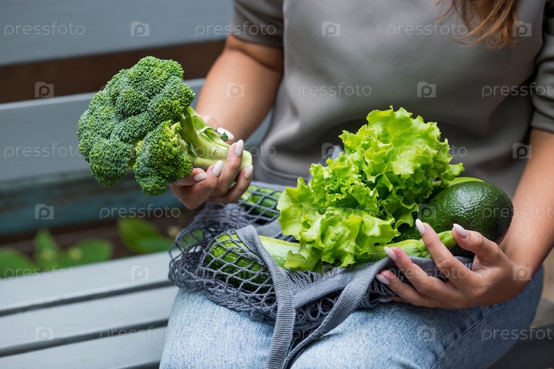 Женские руки с авоськой и зелеными овощами крупным планом. Девушка покупает еду. Концепция здорового питания, вегетарианства и экологии. Отказ от пластиковых пакетов