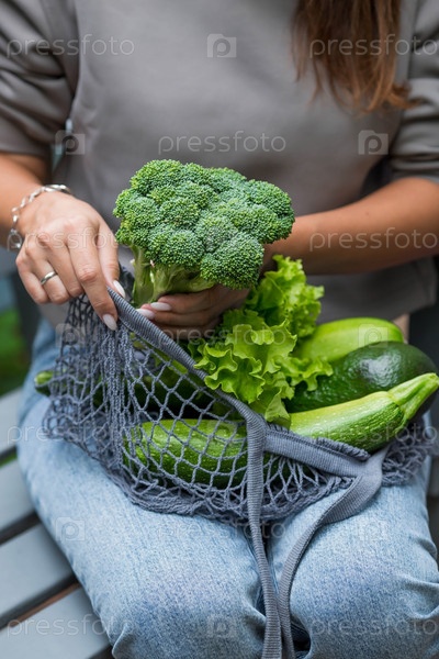 Женские руки с авоськой и зелеными овощами крупным планом. Девушка покупает еду. Концепция здорового питания, вегетарианства и экологии. Отказ от пластиковых пакетов