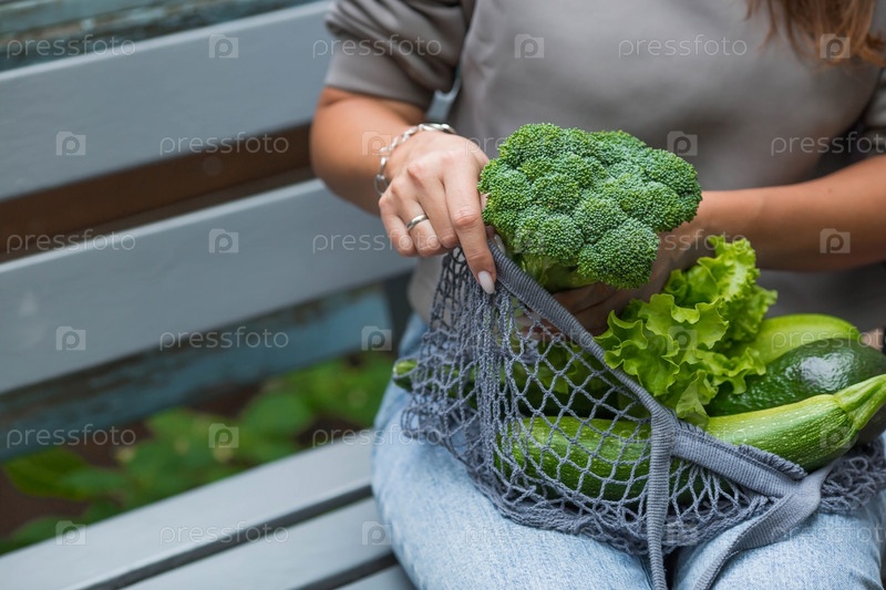 Женские руки с авоськой и зелеными овощами крупным планом. Девушка покупает еду. Концепция здорового питания, вегетарианства и экологии. Отказ от пластиковых пакетов