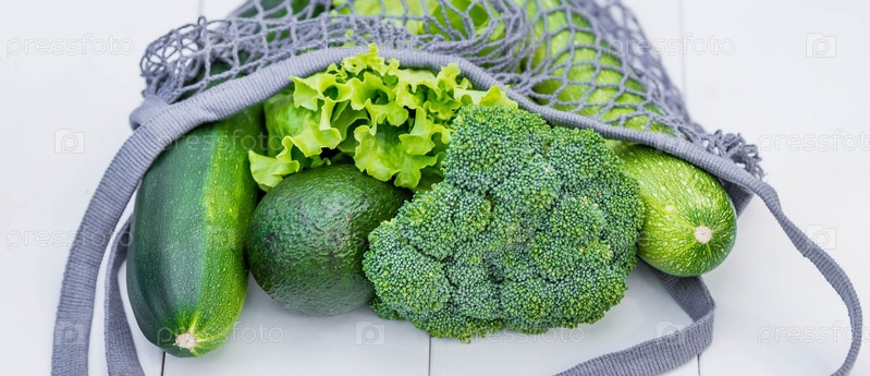 Сумка с зелеными овощами крупным планом на белом деревянном фоне. Продукты здорового, диетического питания. Концепция здорового питания, вегетарианства и экологии. Отказ от пластиковых пакетов