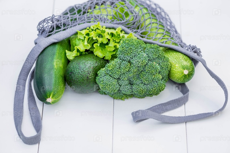 Сумка с зелеными овощами крупным планом на белом деревянном фоне. Продукты здорового, диетического питания. Концепция здорового питания, вегетарианства и экологии. Отказ от пластиковых пакетов