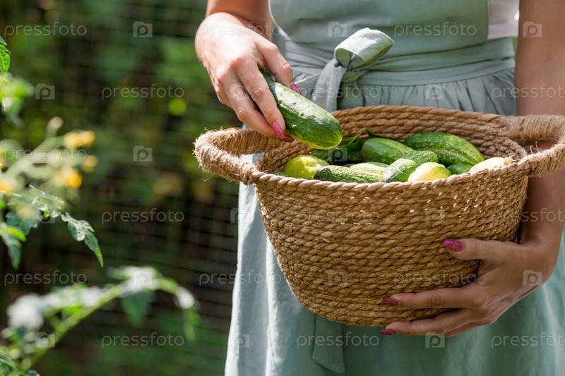 Руки девушки с плетеной корзиной крупным планом. Фермерша в хлопковом фартуке держит огурцы. Концепция сбора урожая в теплице