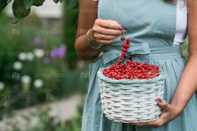 Руки женщины крупным планом. Девушка собирает ягоды. Здоровая спелая красная смородина в миске в летнем саду. Органический набор витаминов со свежими зелеными листьями