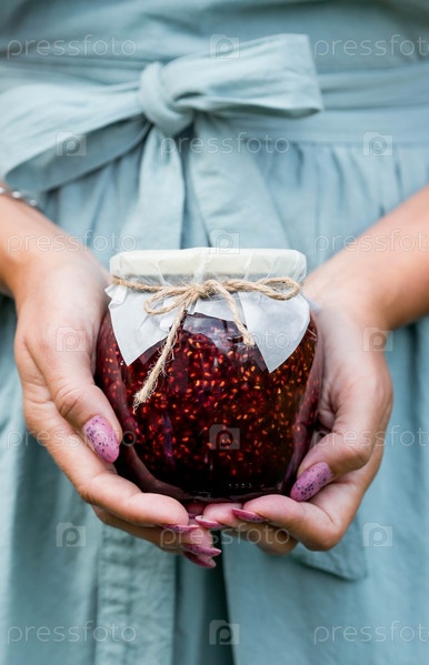 Руки женщины крупным планом. Девушка держит банку малинового варенья. Полезная ягода. Органический набор витаминов. Сохранение урожая