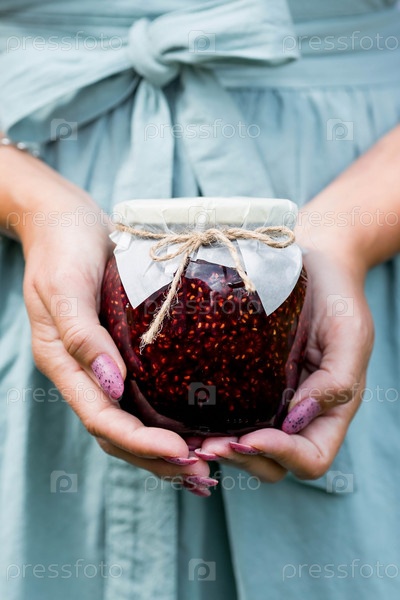Руки женщины крупным планом. Девушка держит банку малинового варенья. Полезная ягода. Органический набор витаминов. Сохранение урожая
