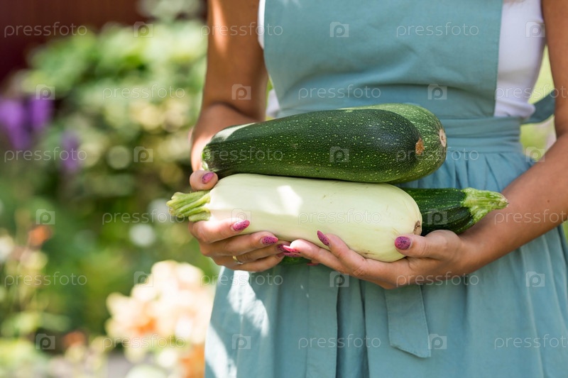Руки девушки крупным планом. Жена фермера в хлопковом фартуке держит кабачки. Концепция сбора урожая летом и осенью