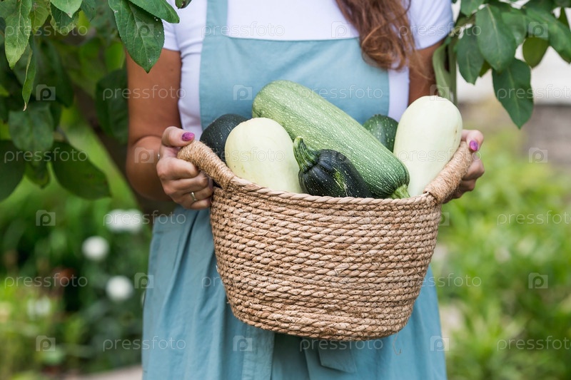 Руки девушки с плетеной корзиной крупным планом. Жена фермера в хлопковом фартуке держит кабачки. Концепция сбора урожая летом и осенью