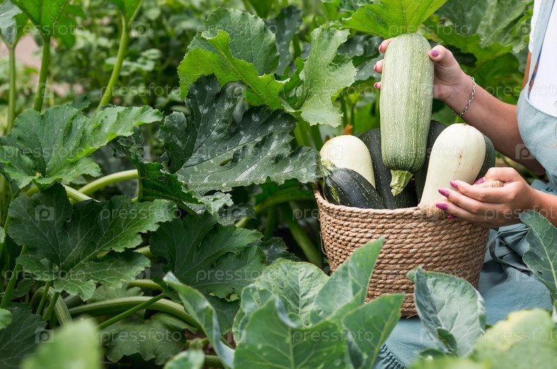 Руки девушки с плетеной корзиной крупным планом. Жена фермера в хлопковом фартуке держит кабачки. Концепция сбора урожая летом и осенью