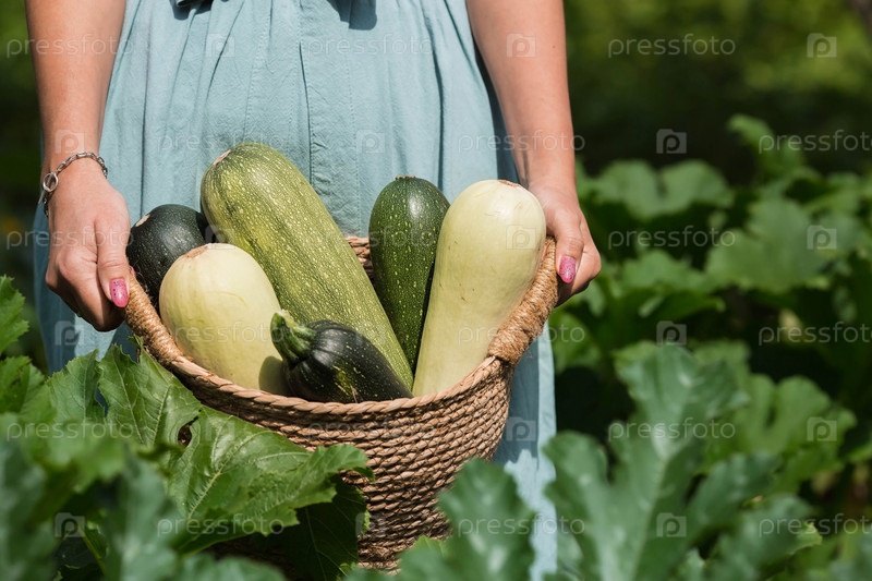 Руки девушки с плетеной корзиной крупным планом. Жена фермера в хлопковом фартуке держит кабачки. Концепция сбора урожая летом и осенью