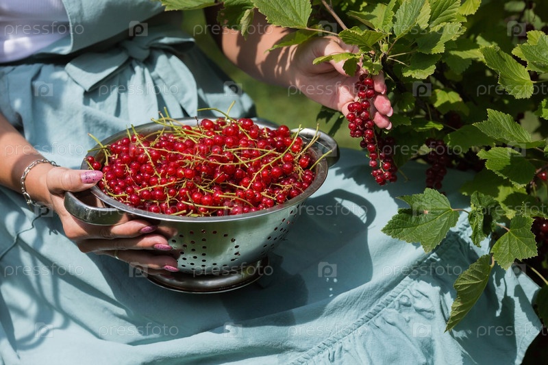 Руки женщины крупным планом. Девушка собирает ягоды. Здоровая спелая красная смородина в миске в летнем саду. Органический набор витаминов со свежими зелеными листьями