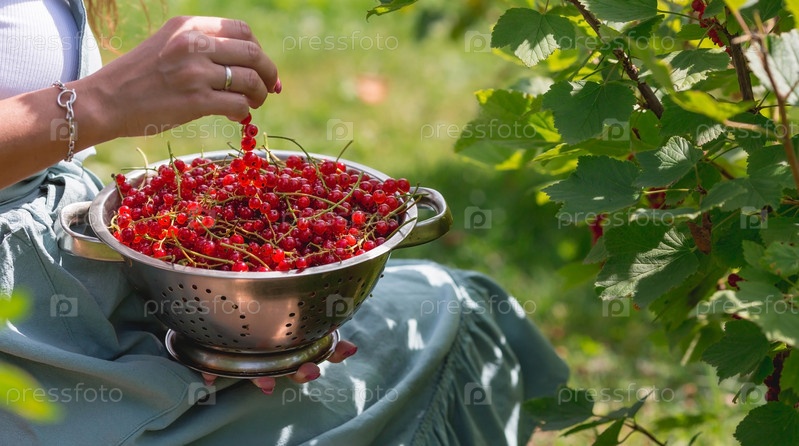 Руки женщины крупным планом. Девушка собирает ягоды. Здоровая спелая красная смородина в миске в летнем саду. Органический набор витаминов со свежими зелеными листьями
