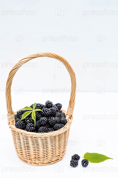 Маленькая плетеная корзина со свежей ежевикой на белом деревянном изолированном фоне. Красивая, полезная спелая летняя ягода