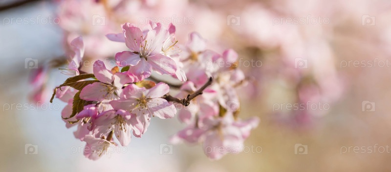 Баннер. Цветение вишни. Весна, природа обои. Вишневый цвет в саду. Цветущие бутоны роз на ветвях дерева в японском саду в дендрарии. Макро фотография. Россия, Царицыно