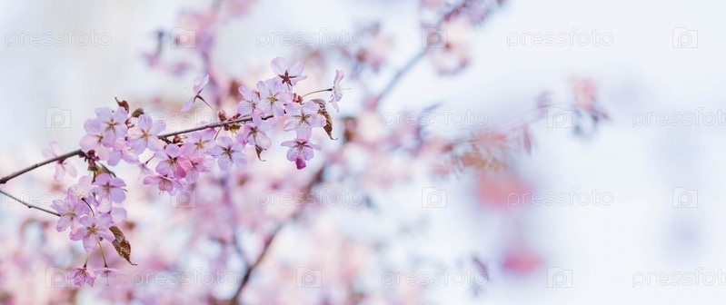 Баннер. Цветение вишни. Весна, природа обои. Вишневый цвет в саду. Цветущие бутоны роз на ветвях дерева в японском саду в дендрарии. Макро фотография. Россия, Царицыно