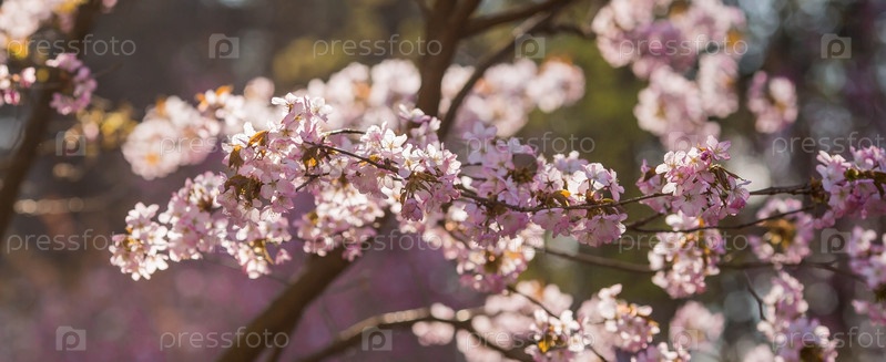 Баннер. Цветение вишни. Весна, природа обои. Вишневый цвет в саду. Цветущие бутоны роз на ветвях дерева в японском саду в дендрарии. Макро фотография. Россия, Царицыно