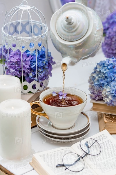 Визуал для контента. Натюрморт в винтажном стиле. Кружка с напитком, старая книга, клетка, свечи и цветы гортензии в саду на белом деревянном столе. Концепция чайной церемонии