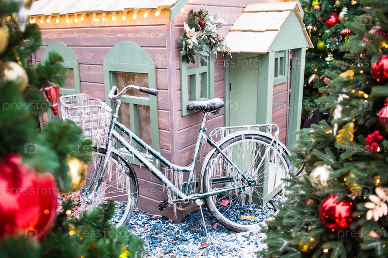 Новый год. Новогодние украшения на улицах Москвы. Небольшой дом и ретро-велосипед в сосульках. Рождественская ярмарка на празднично украшенной Красной площади