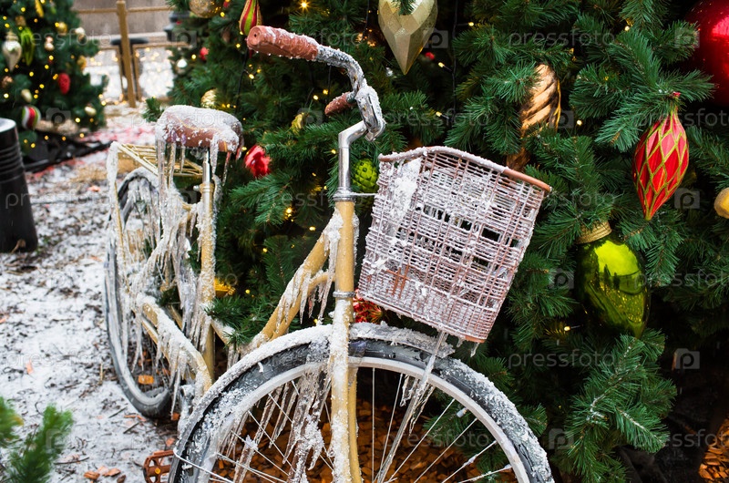 Новый год. Новогодние украшения на улицах Москвы. Небольшой дом и ретро-велосипед в сосульках. Рождественская ярмарка на празднично украшенной Красной площади