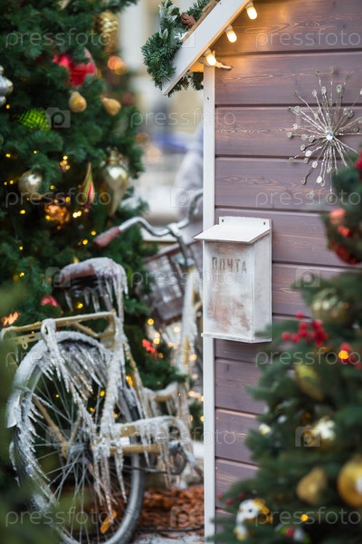 Новый год. Новогодние украшения на улицах Москвы. Небольшой дом и ретро-велосипед в сосульках. Рождественская ярмарка на празднично украшенной Красной площади