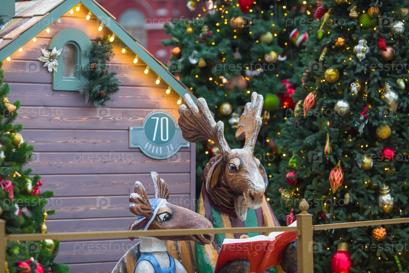 Новогодние украшения на улицах Москвы. Рождественская ярмарка на празднично украшенной Красной площади. Красивая рождественская открытка. Фигура лося крупным планом. Москва