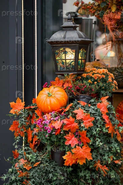 Декоративные тыквы с фестиваля Золотая осень в Москве, возле Красной площади, в Кремле. Декор Хэллоуина с различными тыквами, осенними овощами и цветами. Урожай и украшение сада. Фонарь