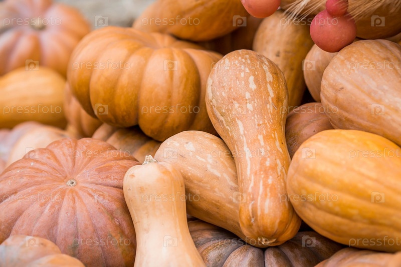 Декор Хэллоуина с различными тыквами, осенними овощами и цветами. Урожай и украшение сада