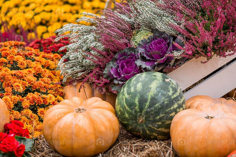 Декоративные тыквы с фестиваля Золотая осень в Москве, возле Красной площади, в Кремле. Декор Хэллоуина с различными тыквами, осенними овощами и цветами. Урожай и украшение сада