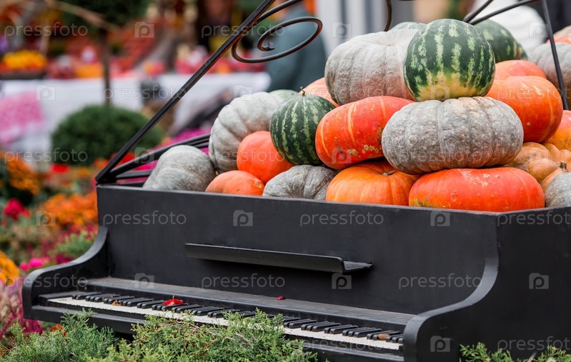 Декоративные тыквы с фестиваля Золотая осень в Москве, возле Красной площади, в Кремле. Декор Хэллоуина с различными тыквами, осенними овощами и цветами. Урожай и украшение сада