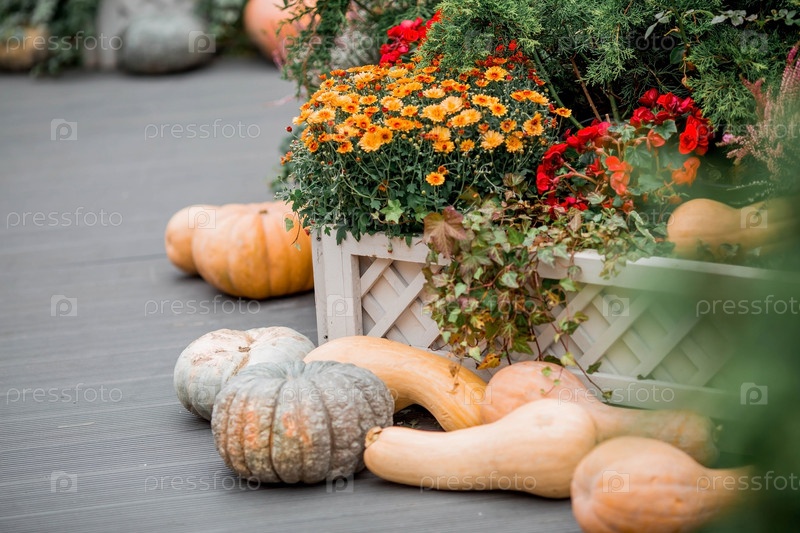 Декоративные тыквы. Декор Хэллоуина с различными тыквами, осенними овощами и цветами. Урожай и украшение сада