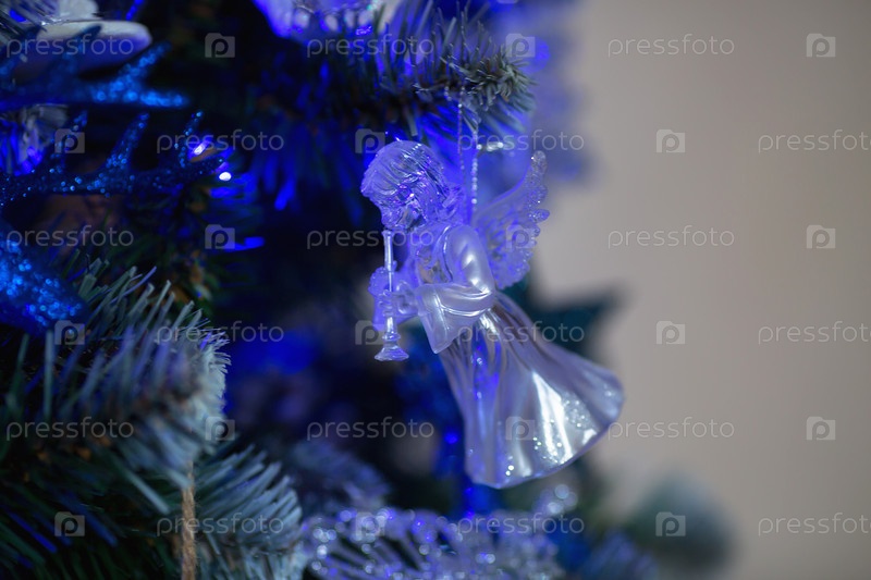 Мягкий фокус. Украшенная елка в бело-голубых тонах. Красивые елочные игрушки на ветках елки. Праздничный фон
