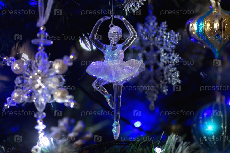 Мягкий фокус. Украшенная елка в бело-голубых тонах. Красивые елочные игрушки на ветках елки. Праздничный фон